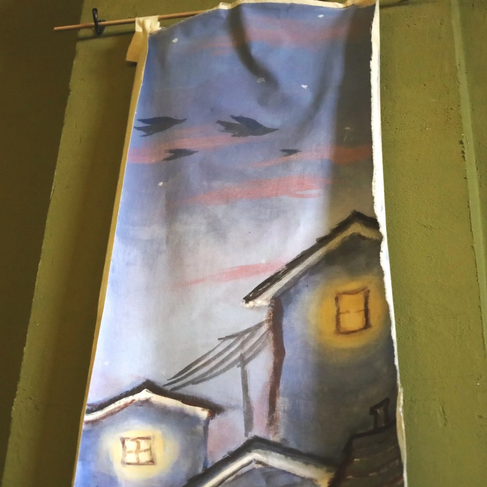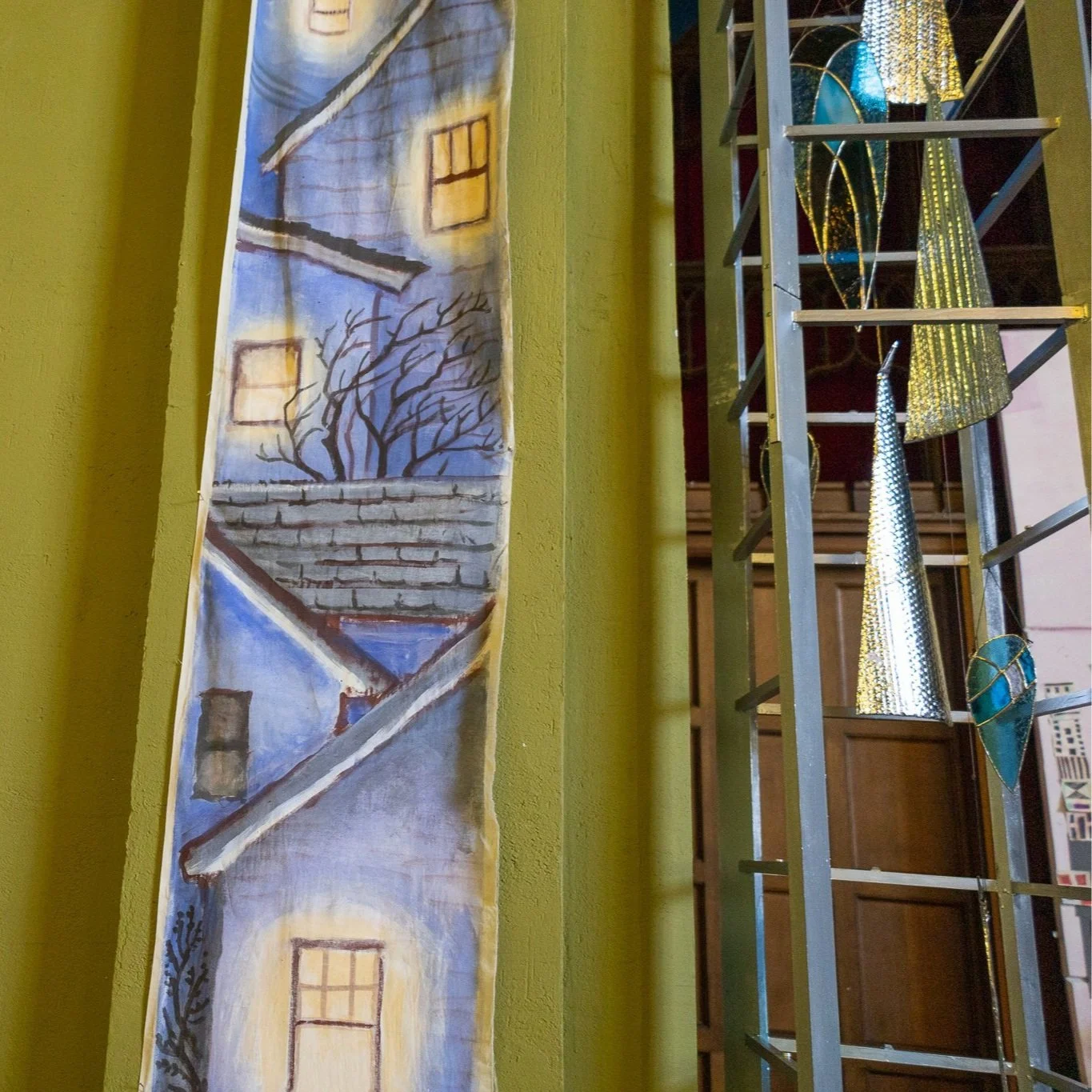 From afar, these two banners seem to depict a simple neighborhood with houses positioned close together at dusk. The primary color is a soft dark blue with a pink hue near the top to show that the sun has just set, with splashes of yellow as well. Upon a closer look, we can see that each house has a light on at each window, with some even having the front door cracked open.