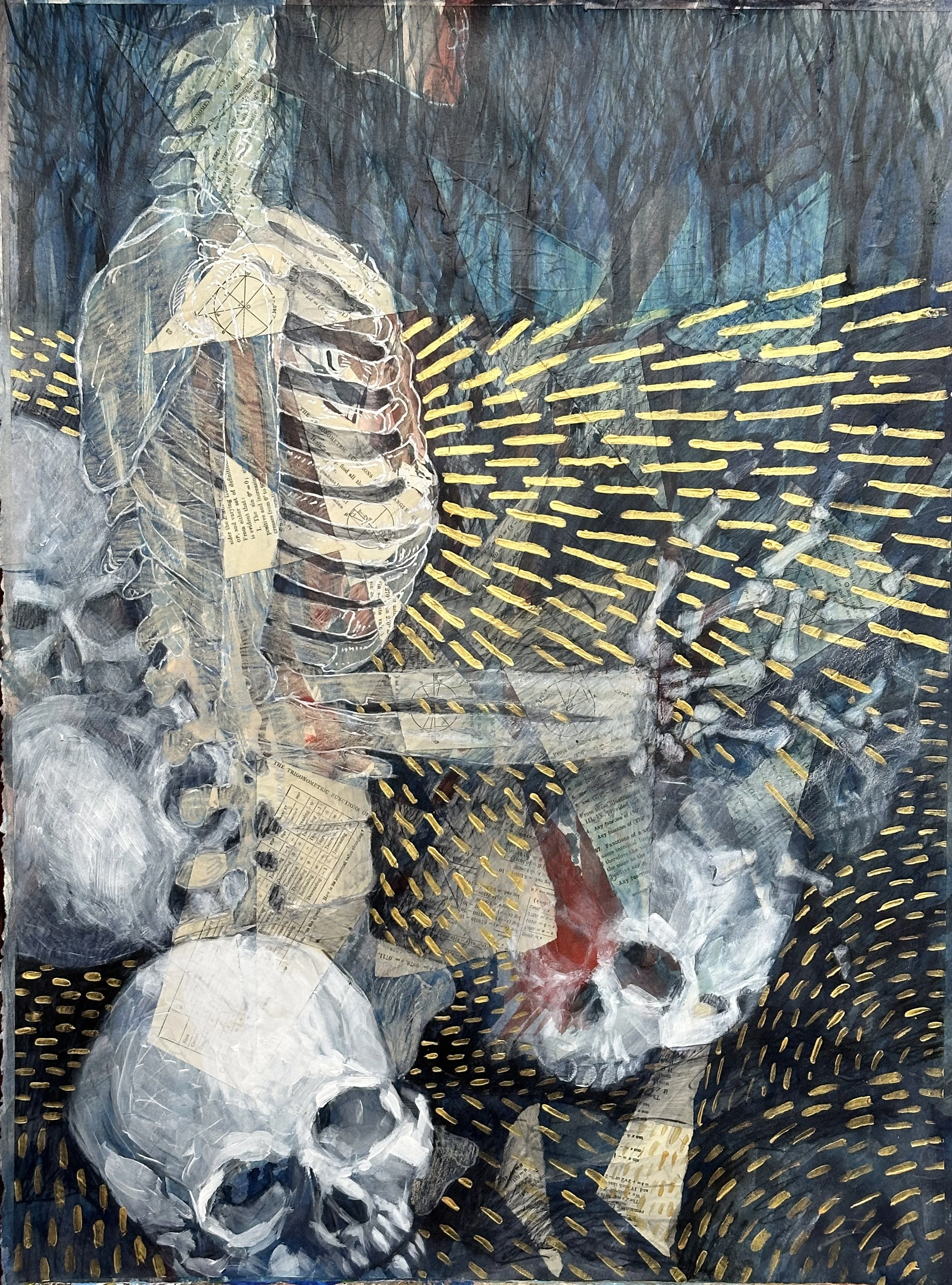 These two collages are jarring when you first see them. The first one depicts a closeup of a person’s skeletal torso in profile juxtaposed overlaid with five skulls that are pieced together from pages from a math textbook on top of a dark blue background. Upon closer examination, dark trees form a foreboding line behind the skeleton. The painterly feel of these trees gives them even more movement, as if they are swaying in a harsh breeze. Despite this somewhat frightening depiction, the piece is studded with golden yellow lines, some of which emanate from the torso and point outward towards something else. These golden dashes create a more hopeful undertone for this piece, making it feel that the concept of death that is introduced by the skulls and skeleton are not the end. This is encouraging because of the confusing nature of death; the math sheets that are torn and worked into the skeleton and skulls seem to call out how anti-order death really is; that we were not created to be separated from our loved ones in this devastating manner. The brightness of the golden dashes points us to the other piece to finish the story.
