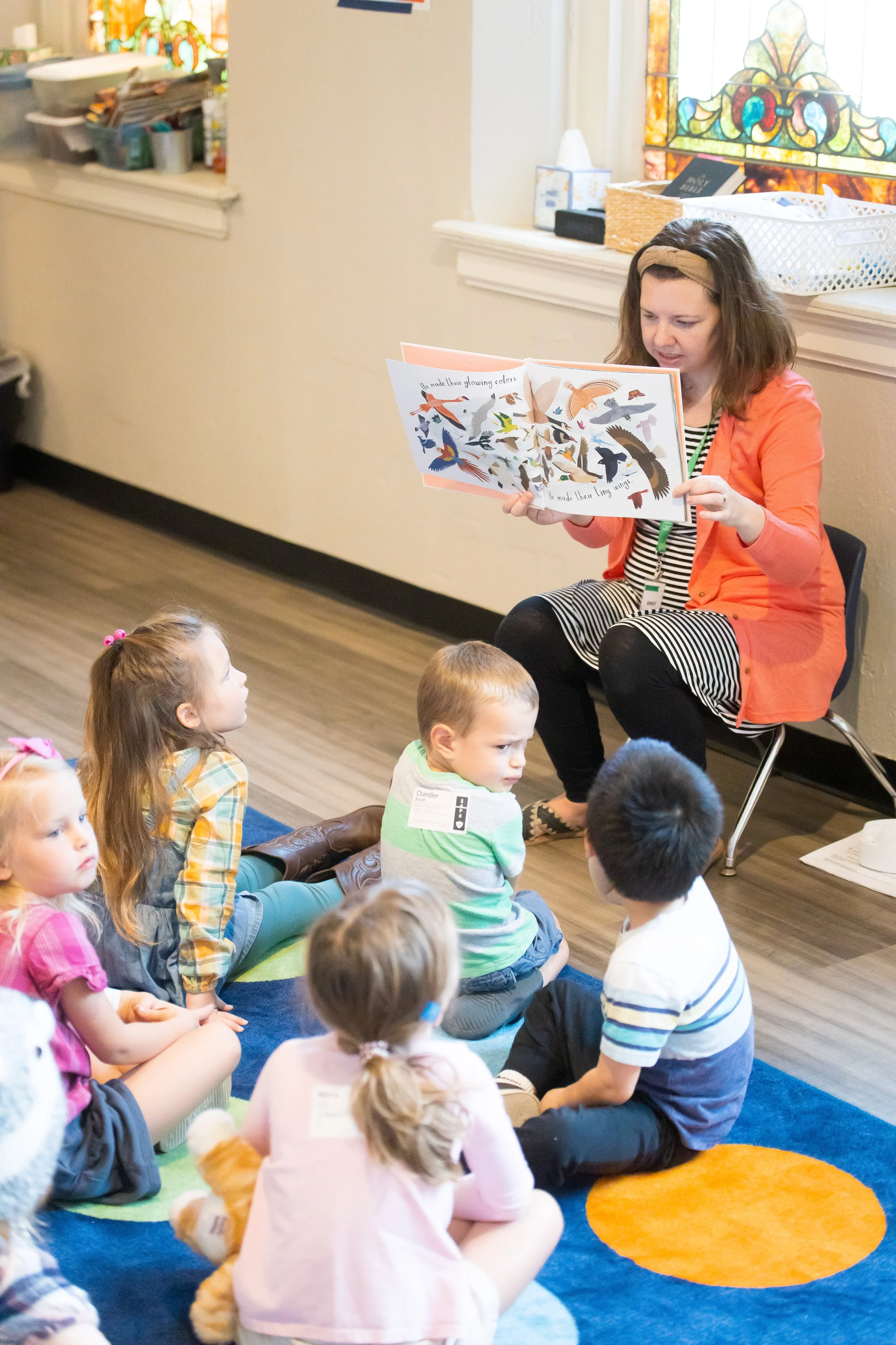 During Children’s Worship, children build relationships with each other and classroom volunteers through play, songs, Bible Story discussions, and activities.